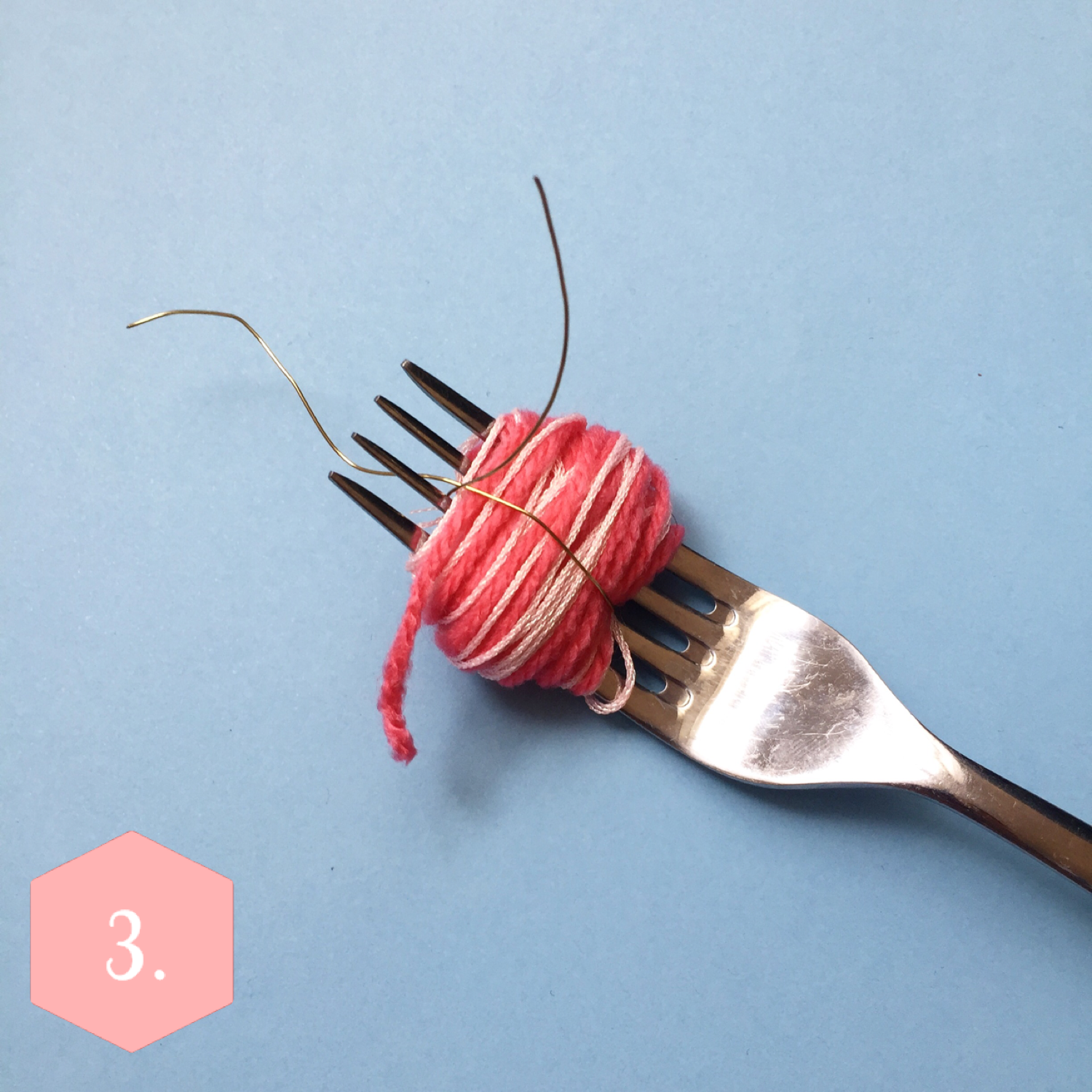 Glissez ensuite votre fil entre les dents de la fourchette et serrez bien (moi, j’avais du fil de fer doré, je trouvais ça plus commode, mais un brin de laine sera aussi efficace). Faites un noeud.