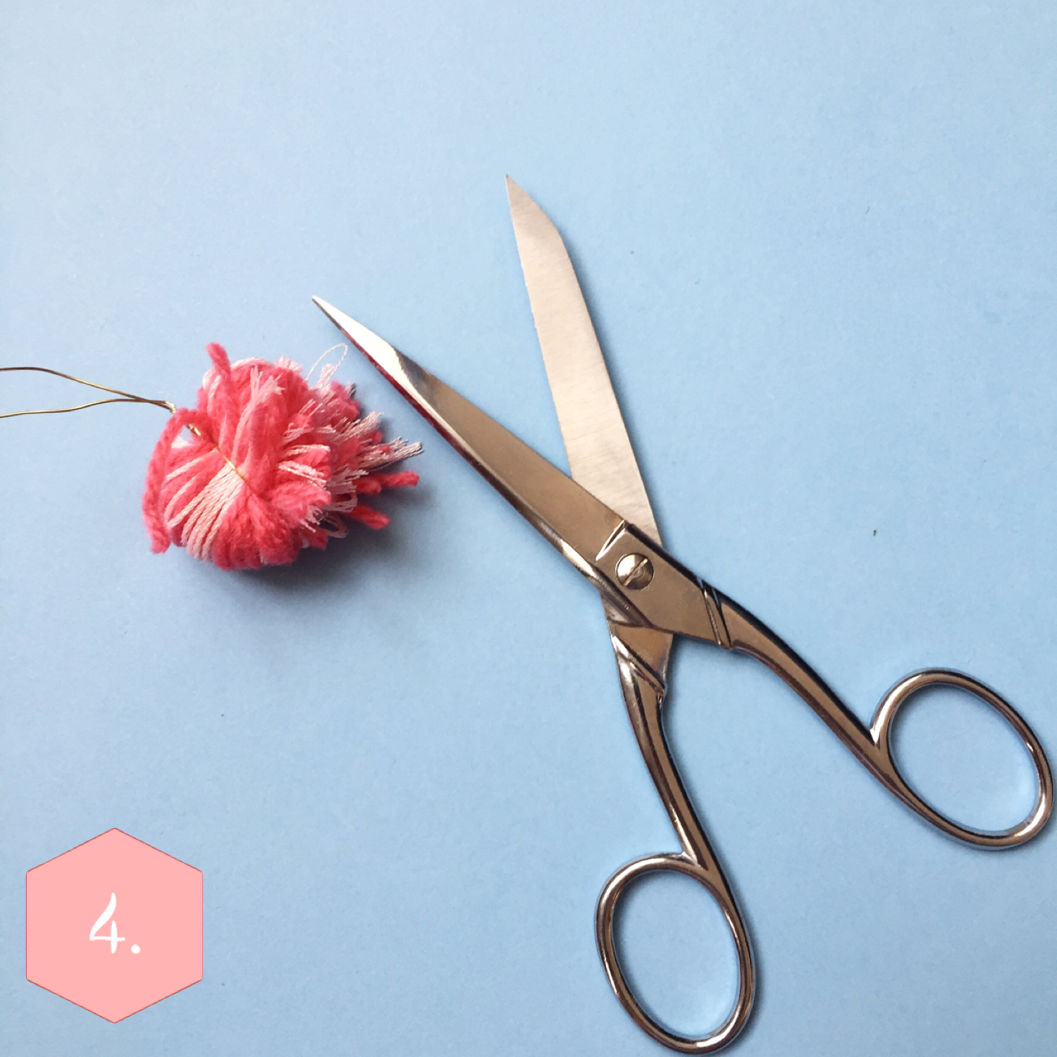 Poussez cette “boule” en dehors de la fourchette. Coupez les brins externes de votre pompon. Ebouriffez-le puis égalisez les brins avec les ciseaux. Votre pompon est terminé !