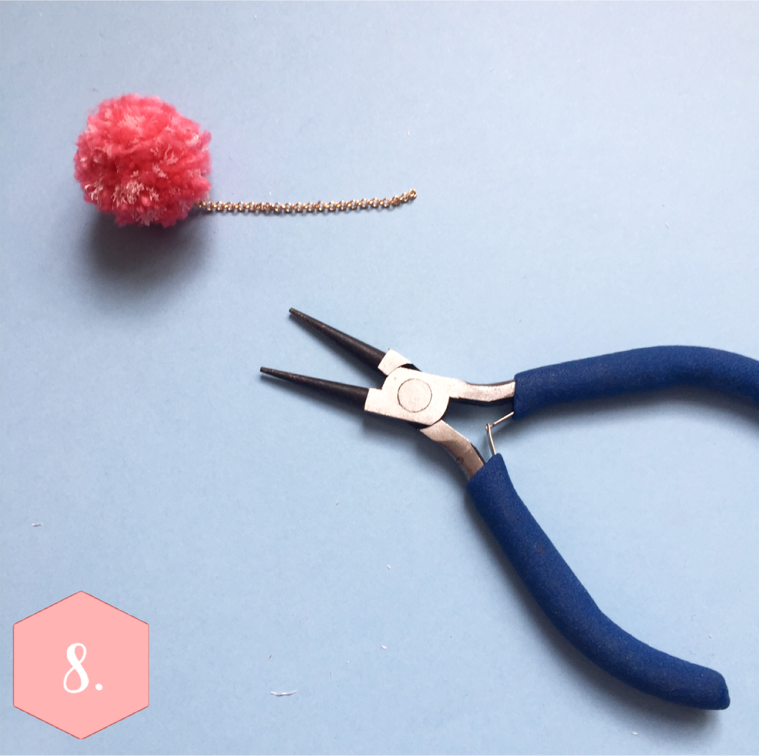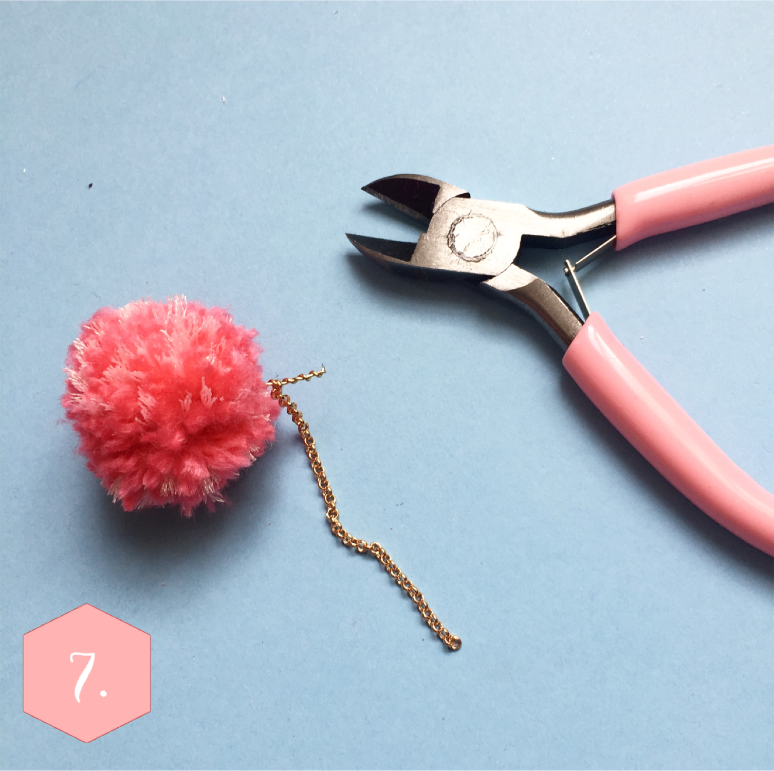 Puis coupez environ 5cm de chainette dorée, fixez l’une des extrémités de la chaînette à l’aide d’un anneau au pompon (en le passant dans le brin de laine, ou dans le fil de fer). Puis fixez l’autre extrémité à votre attache de boucle d’oreille !