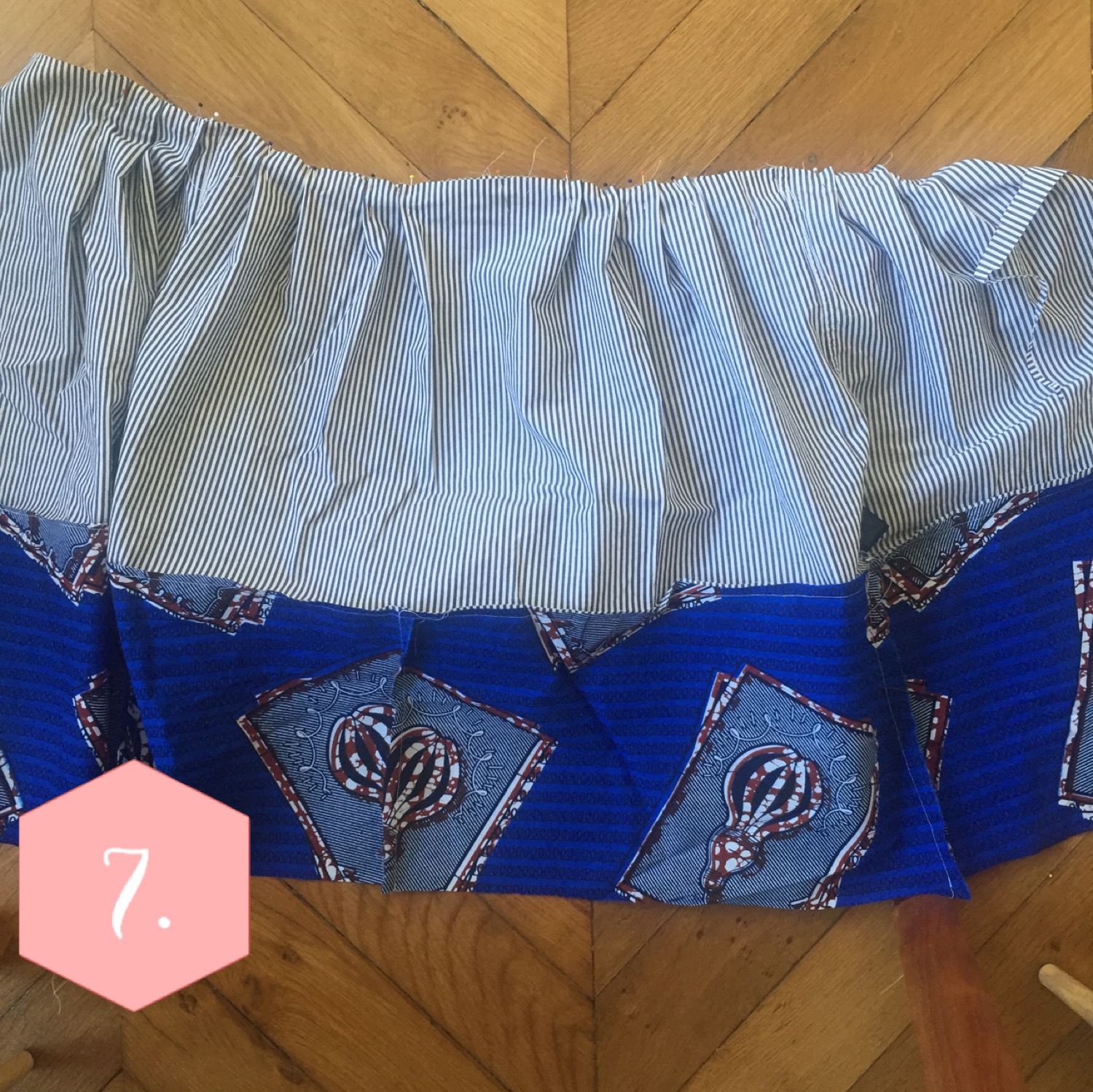 Vous allez maintenant assembler le haut de la robe et le bas. Le bas est plus large que le haut, et pour créer le volume du bas de la robe, on va réaliser des plis. Pour ma part, 3 plis sur chaque pan de devant, et 4 plis sur l’arrière. Commencez dans un premier temps a épingler endroit contre endroit les extrémités et les coutures du côté. Puis marquez les plis, épinglez, faites de même en symétrique et vérifiez que l’ensemble est régulier.