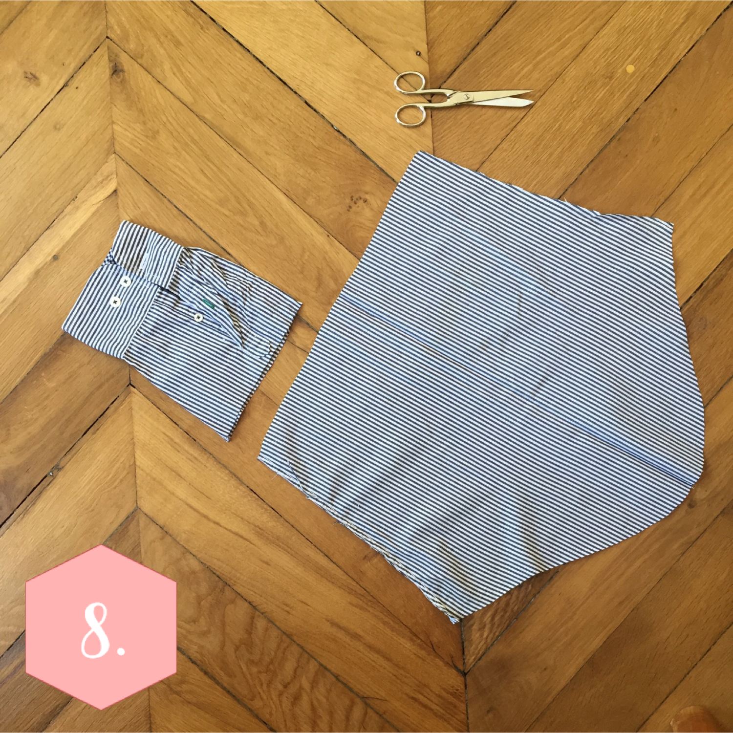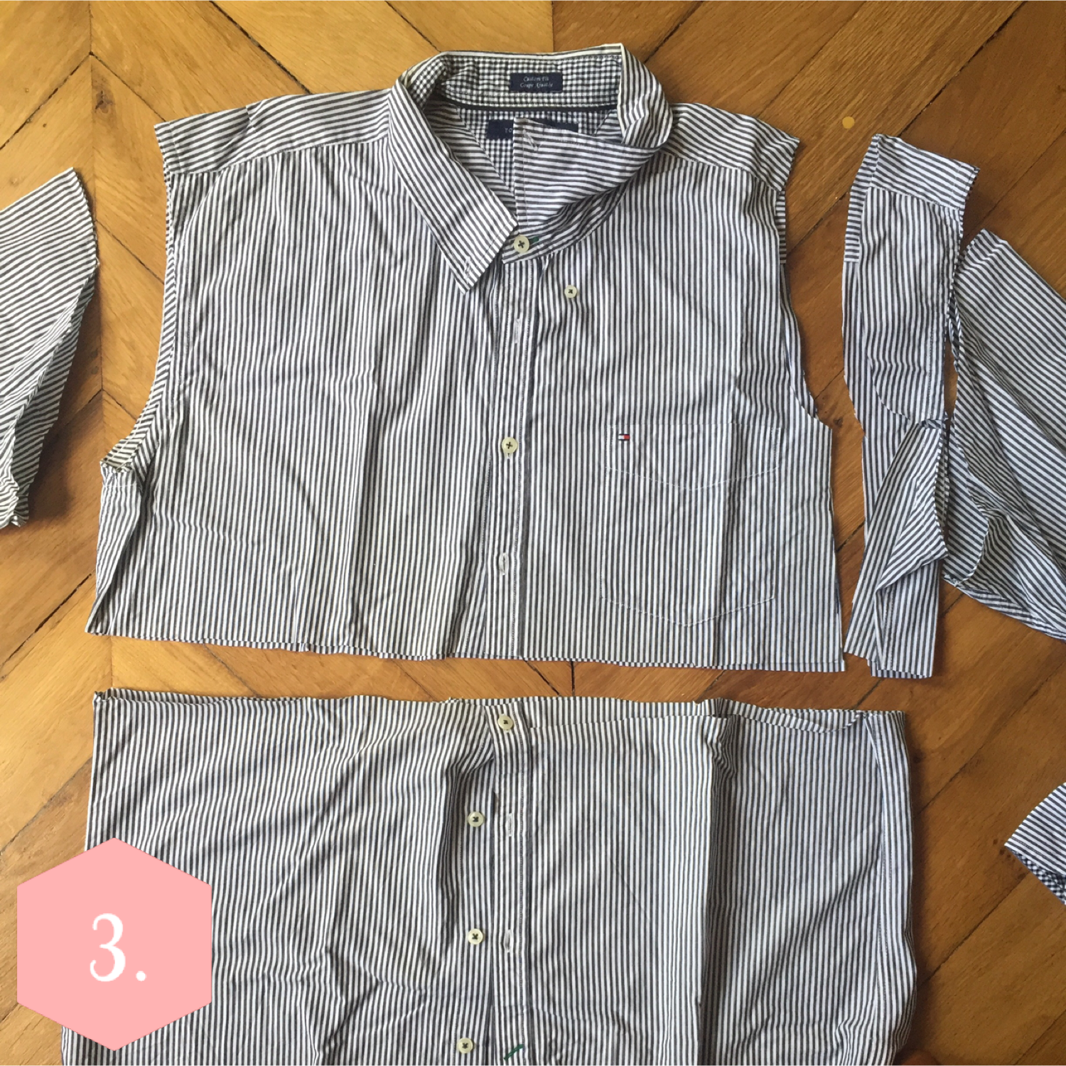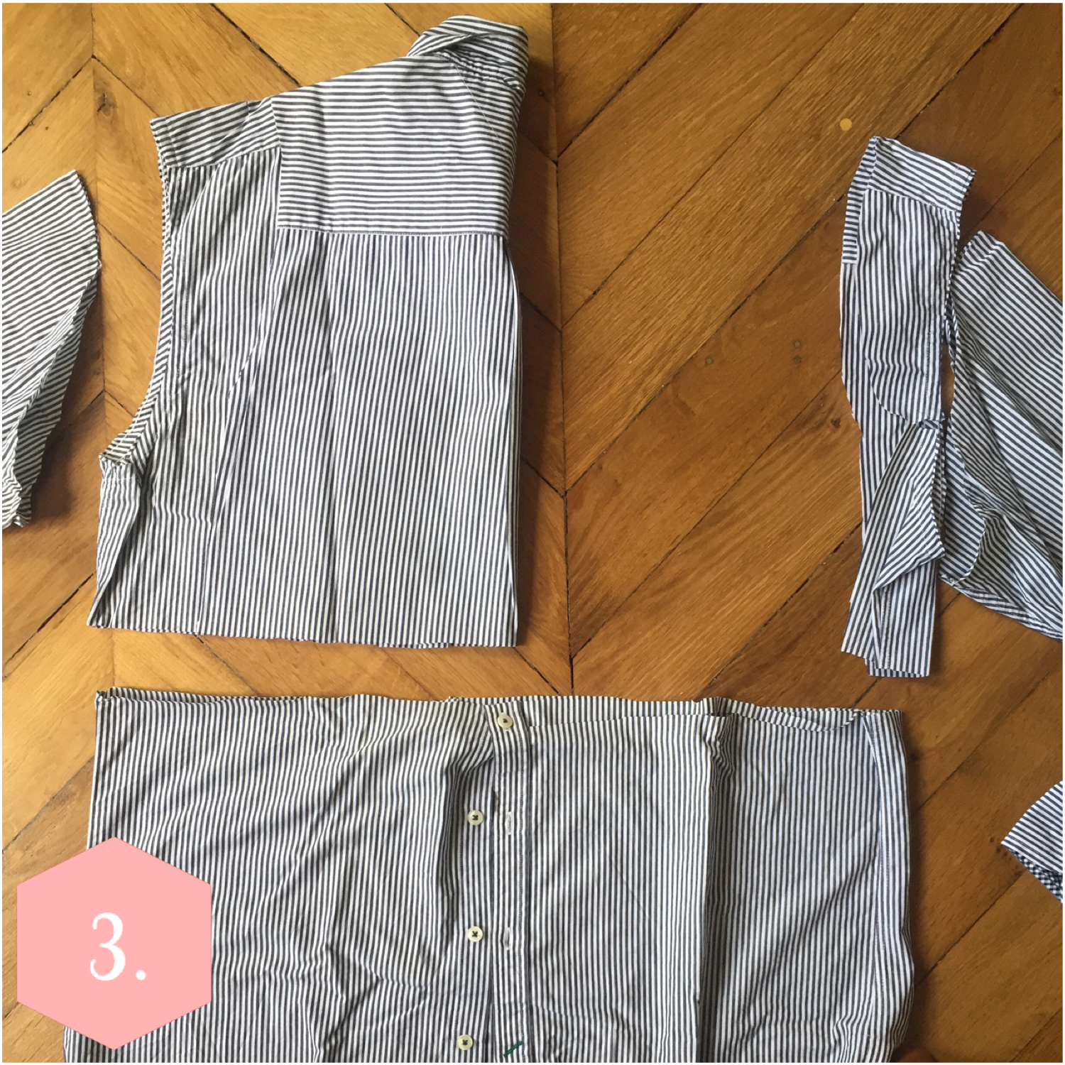 Enfin, presque la dernière étape, les manches. Prenez les anciennes manches de la chemise, placez la manche de cette même robe en coton qui vous va bien sur celle-ci, et découpez à 1 cm de l’extrémité de la manche.