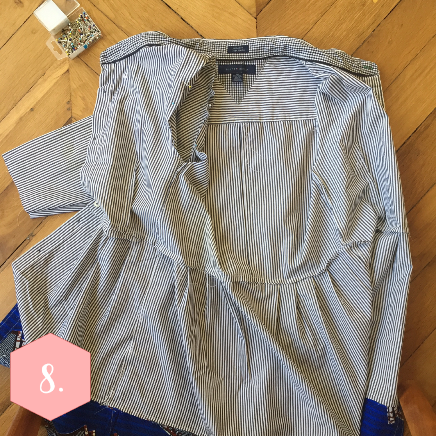 Munissez vous du bas du corps de la chemise. Si besoin, découpez l’ourlet de la chemise pour former une ligne droite. Découpez un rectangle de la longueur de votre bas de chemise + 4 cm de chaque côté, et de 30 cm de largeur, dans votre coupon de wax (ou autre imprimé !). Epinglez endroit contre endroit le bas de la chemise et votre coupon de wax, et faites une couture sur toute la longueur. Rabattez le surplus de tissu sur le côté en marquant un ourlet de 2 cm. Faites une surpiqûre dans la longeur en poursuivant les surpiqûres déjà existantes de la chemise.