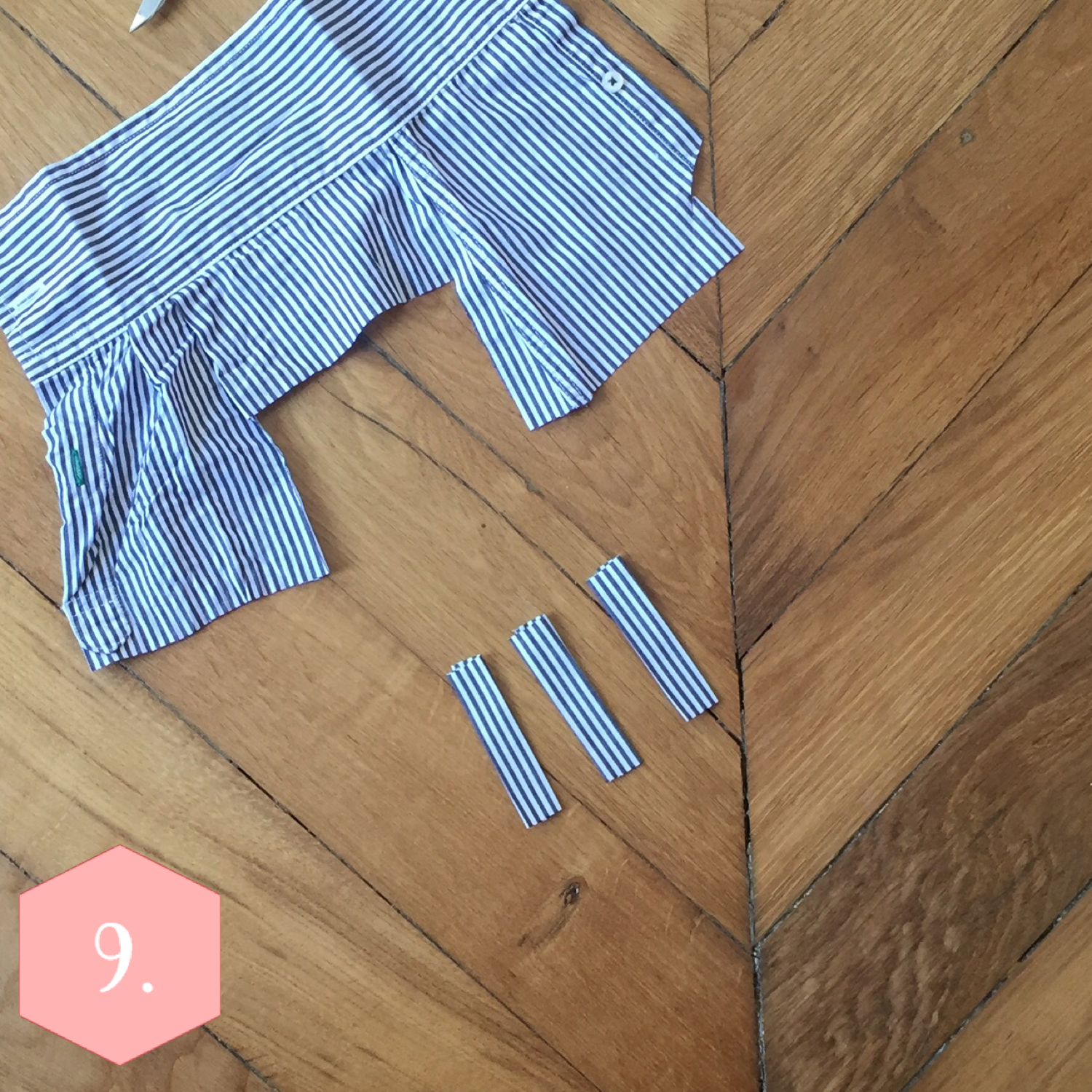 Pour terminer la robe, je vous conseille de porter une ceinture. et donc de rajouter des passants à l’ensemble. Prenez l’extrémité d’une des manches, et découpez 3 rectangles de 6 cm sur 4 cm. Marquez les ourlets au fer à repasser, faites une couture pour les maintenir, et épinglez les passants sur le corps de la robe.