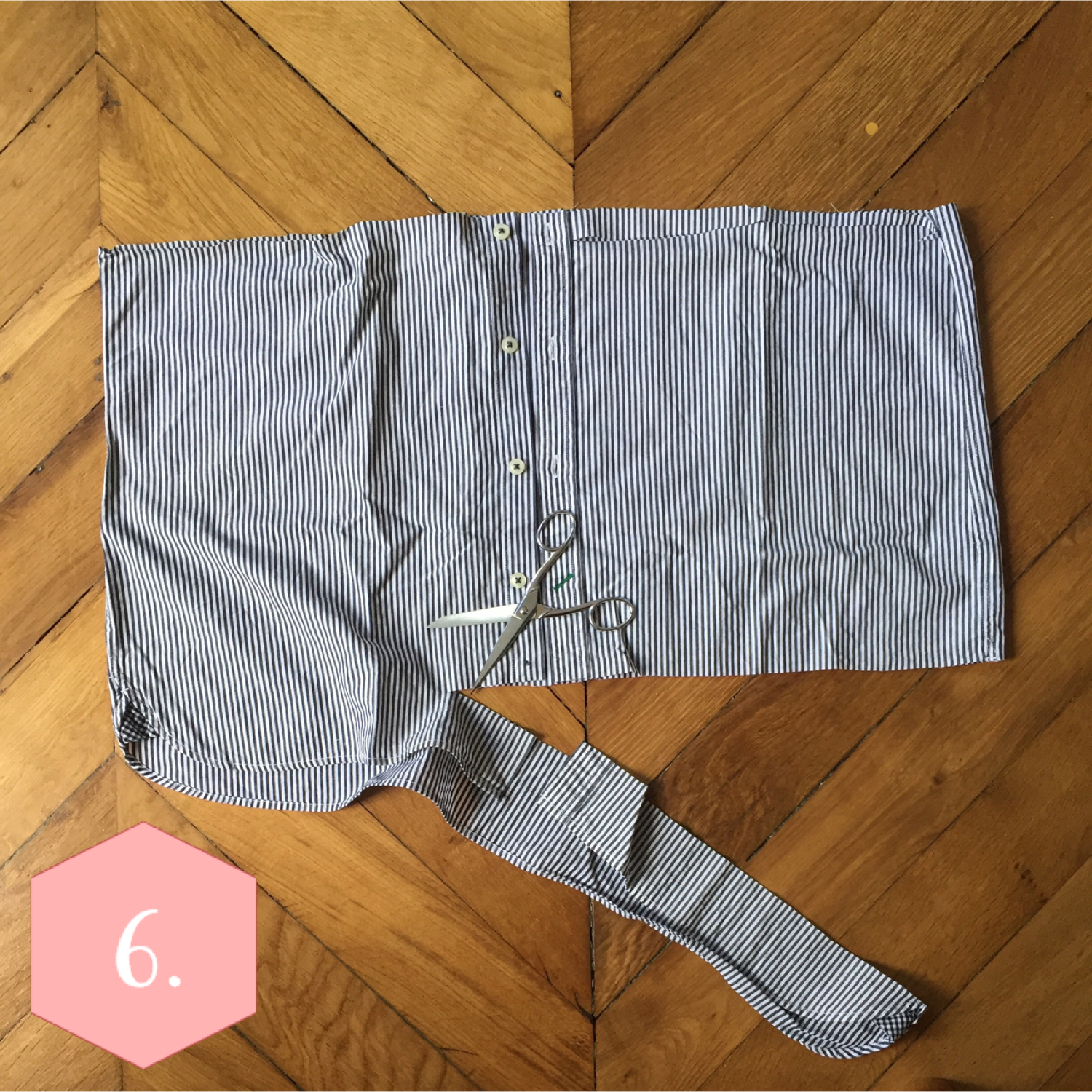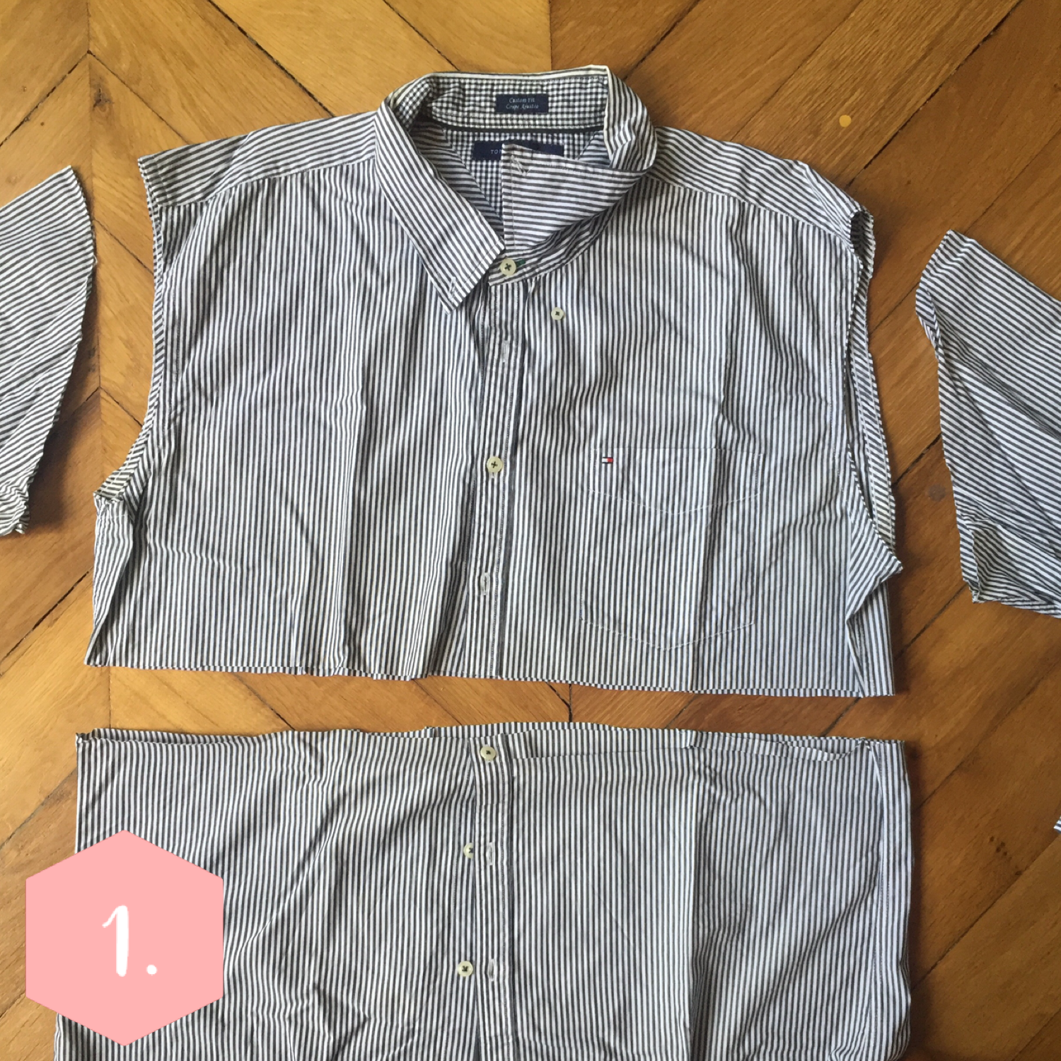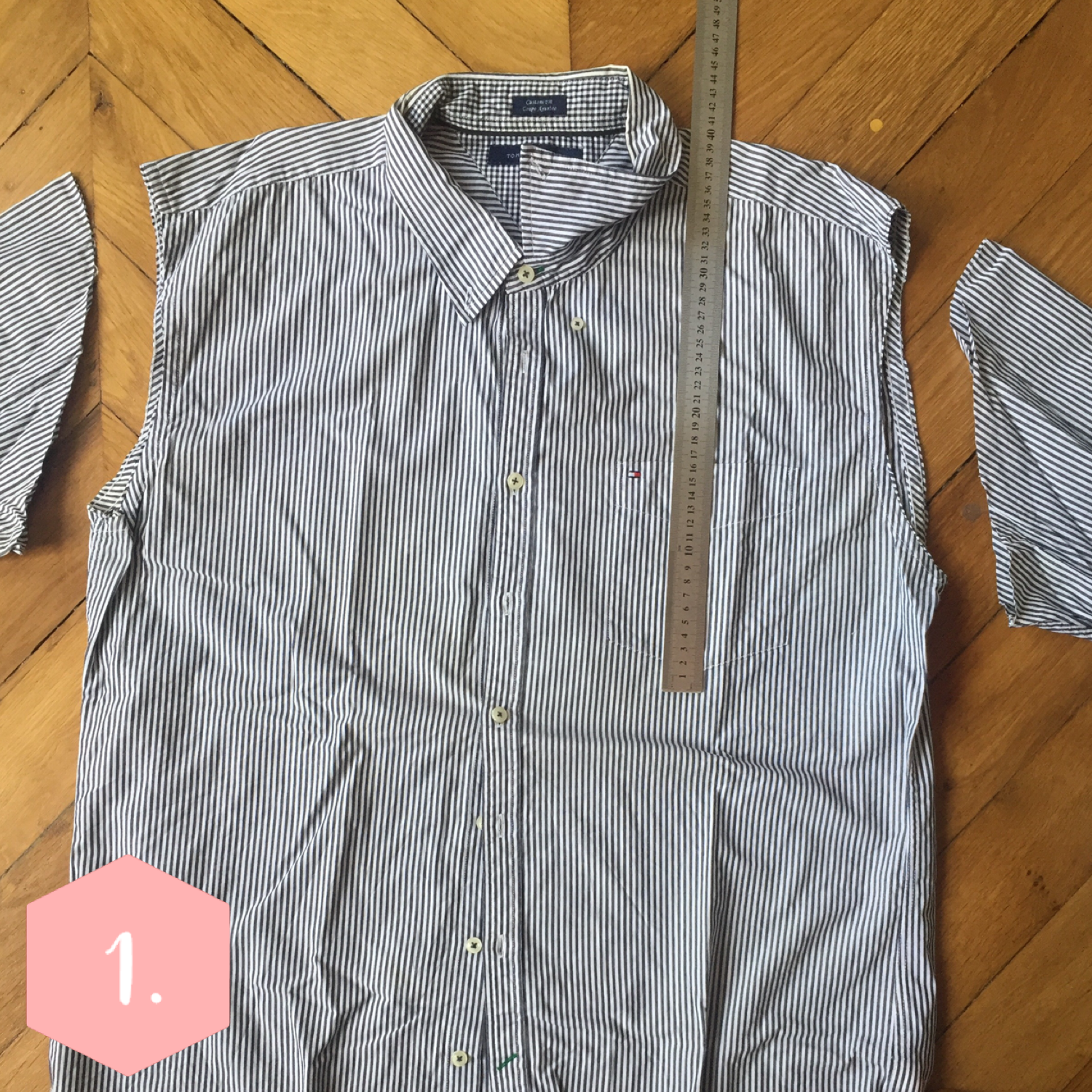 Coupez le long des manches pour libérer le corps. Puis tracez une ligne à 40 cm de la ligne des épaules et découpez tout le long de la chemise.