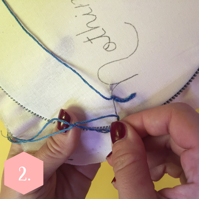 1. Piquer l’aiguille par l’envers et ressortir le fil sur le dessus à l’extrémité du motif à broder.
