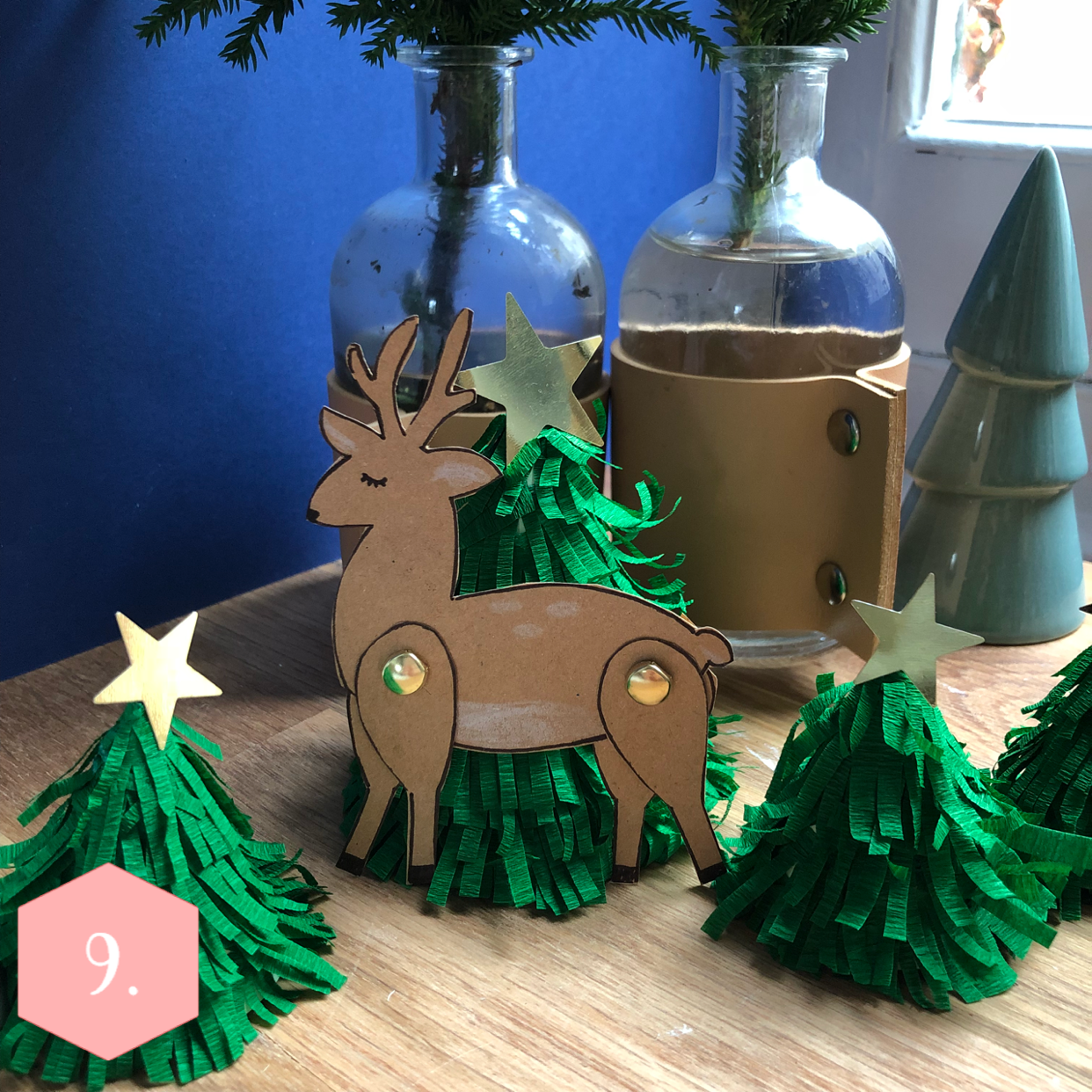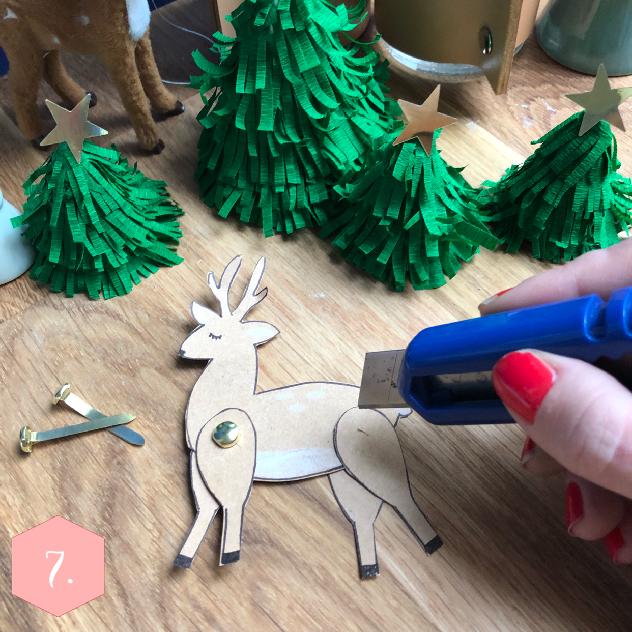 Pour le faon, reportez les gabarits sur du papier cartonné kraft. Reportez également les détails des yeux, sabots, et museau, à l’aide d’un feutre noir. Marquez à l’aide d’un crayon de couleur blanc les taches, le ventre, les oreilles et la queue (Photo n°6).