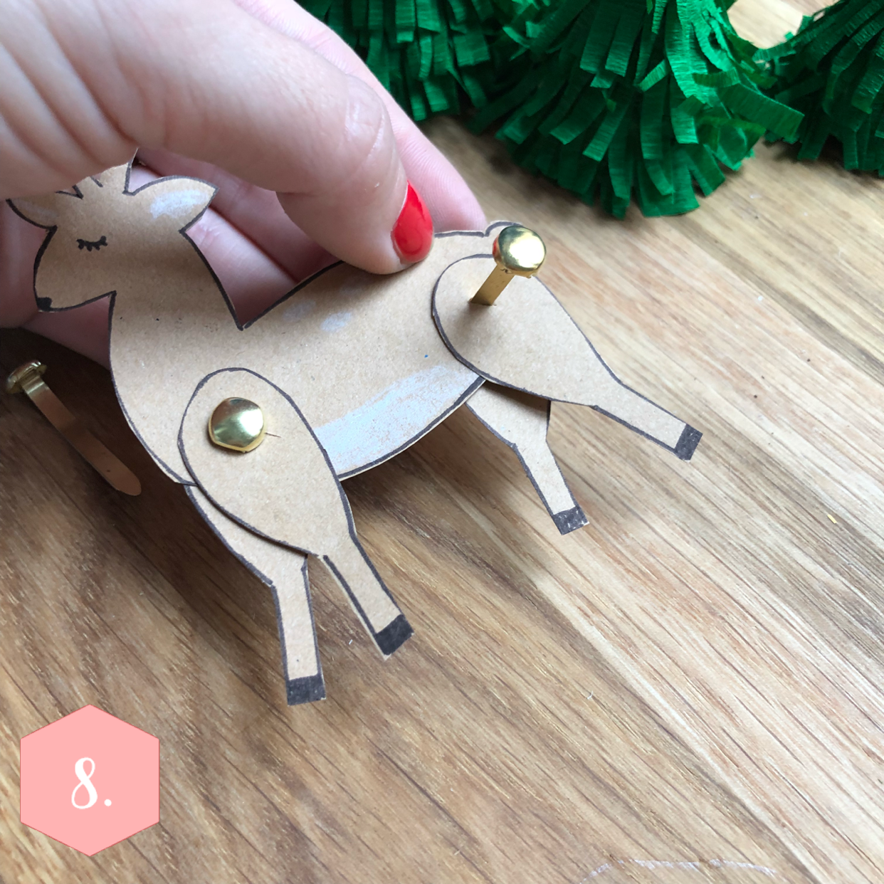 Placez les jambes à l’endroit désiré (en évitant la tête…). Utilisez un cutter pour percer un trou à travers les trois épaisseurs (les deux jambes, et le corps) (Photo n°7)
