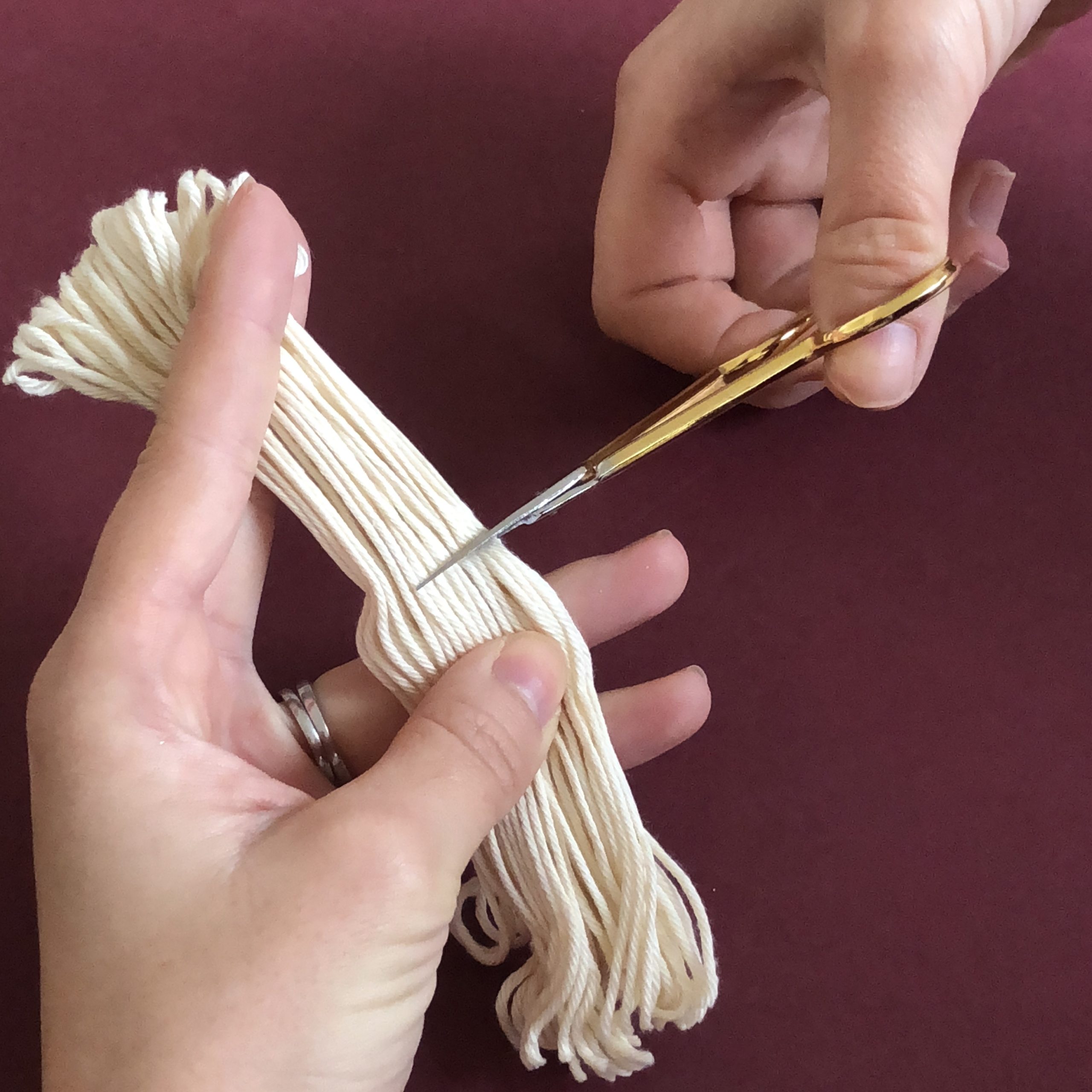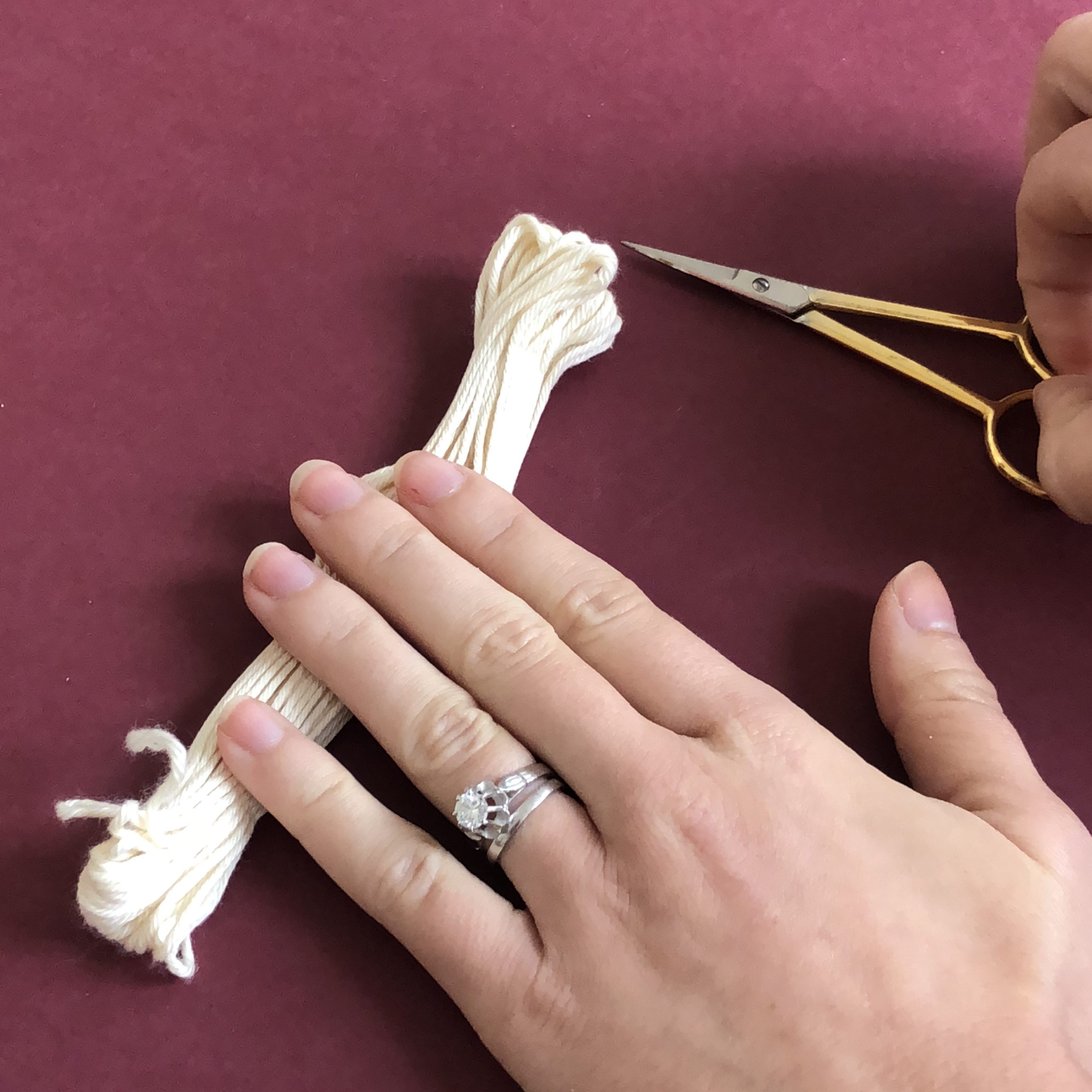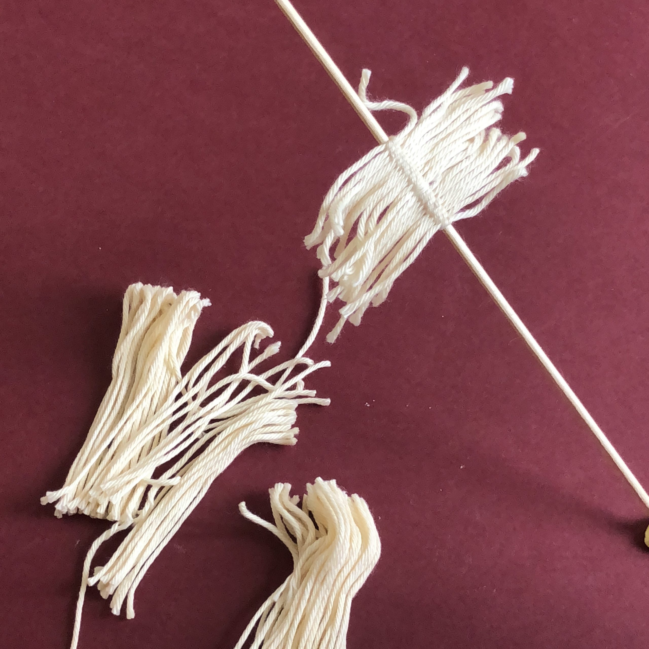 Pour commencer, découpez des brins de fil de 6 cm environs de longueur. Pour me simplifier la tâche, et gagner du temps j’ai découpé les deux extrémités de mon écheveaux, et coupé au milieu.